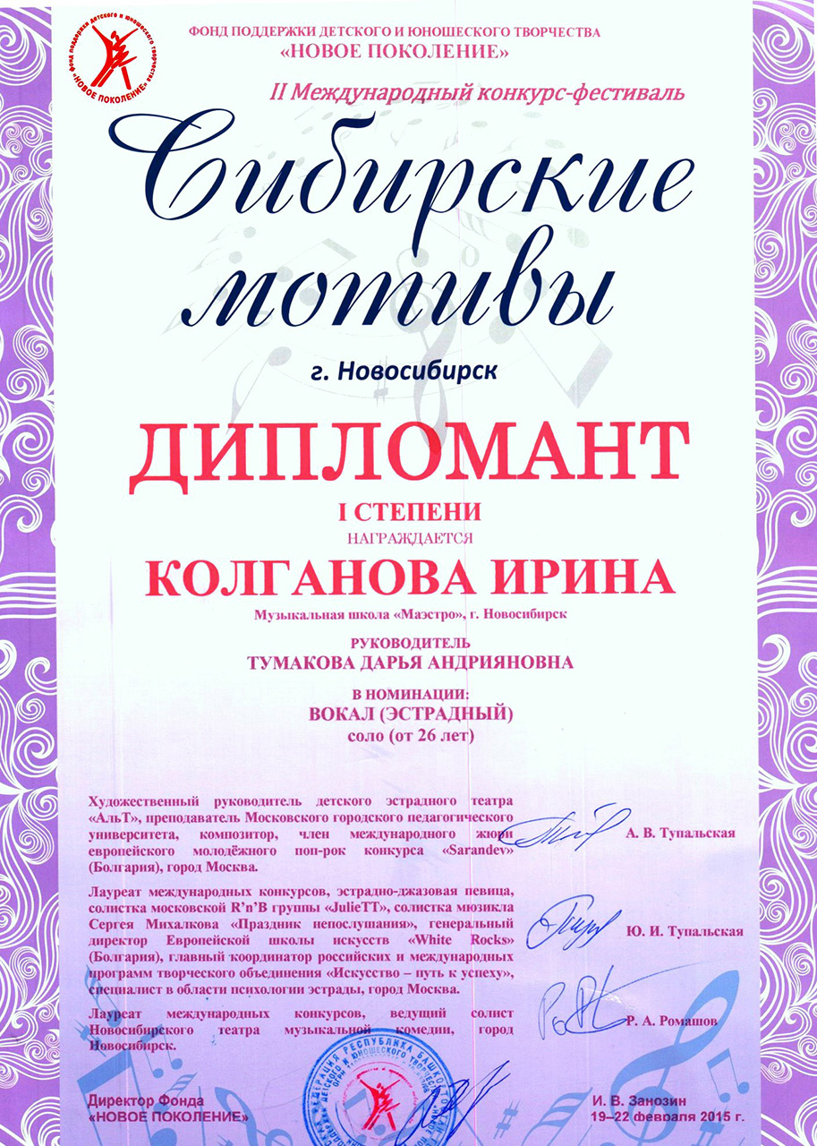 Образование: Новосибирская государственная консерватория им.М.И.Глинки, класс Народной артистки СССР, профессора Л.В. Мясникововой.