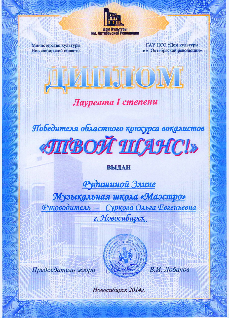Элина Рудишина, после 3-х месяцев обучения, стала лауреатом 1-й степени областного конкурса "Твой шанс!". Сейчас она является обладателем более 5-ти наград всероссийских конкурсов вокального мастерства.